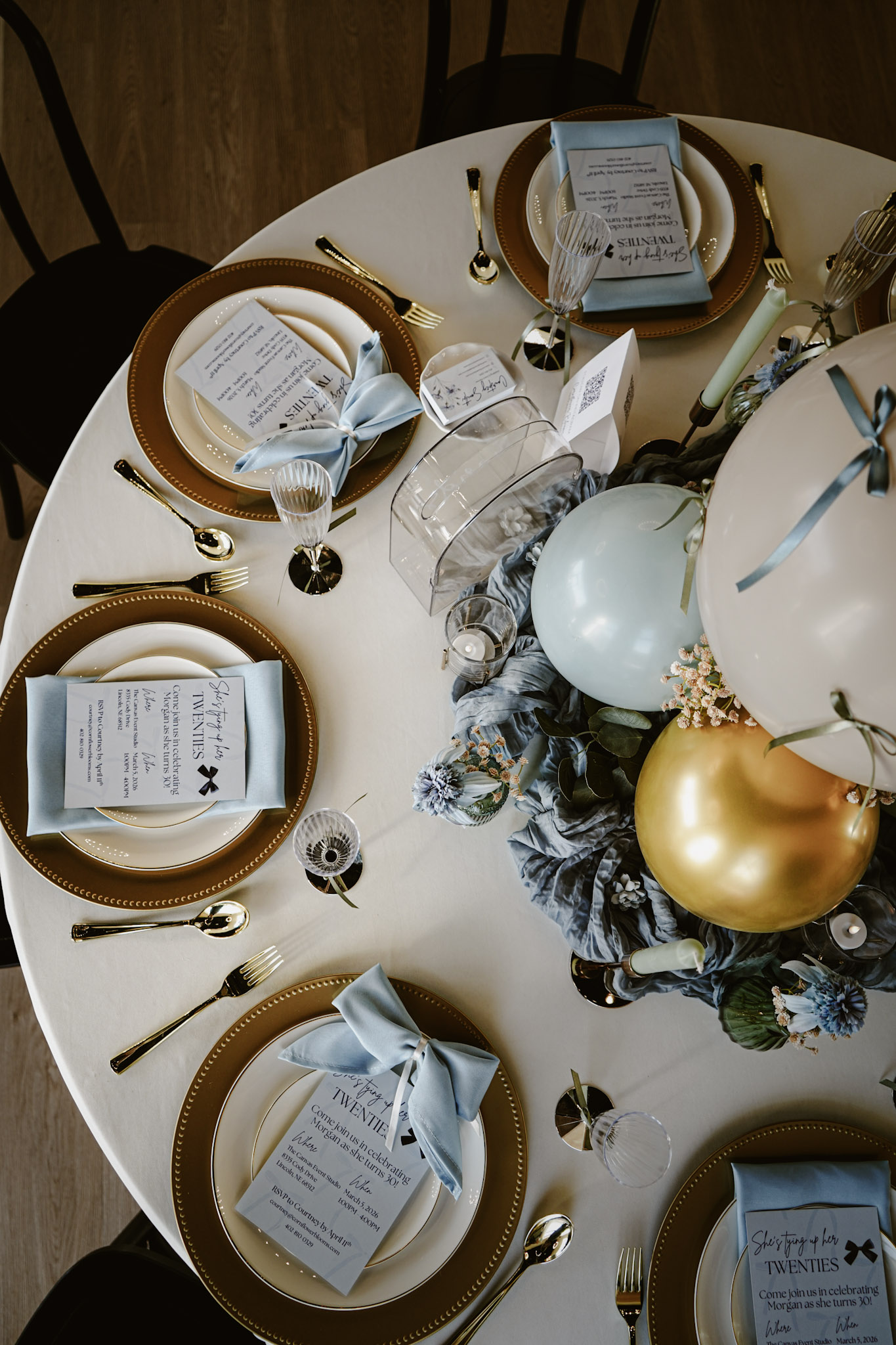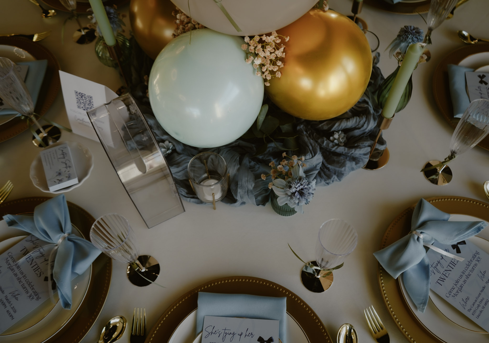 We had disposable silverware, plates, and flutes. The gold charger plates & votive holders are from Dollar Tree. We did hit up Hobby Lobby for some of the pretty touches. And the rest are Amazon or Canva Print designed by yours truly ๐