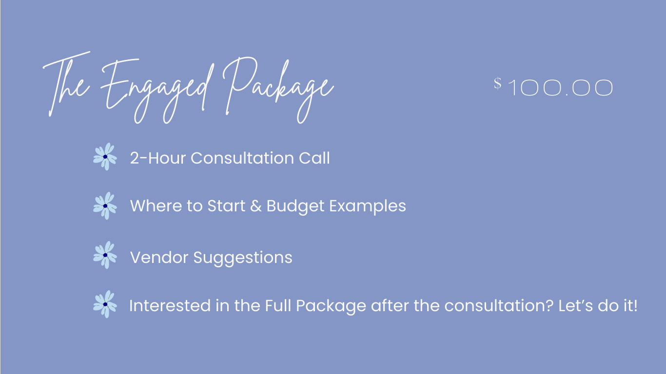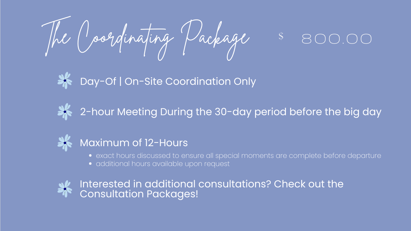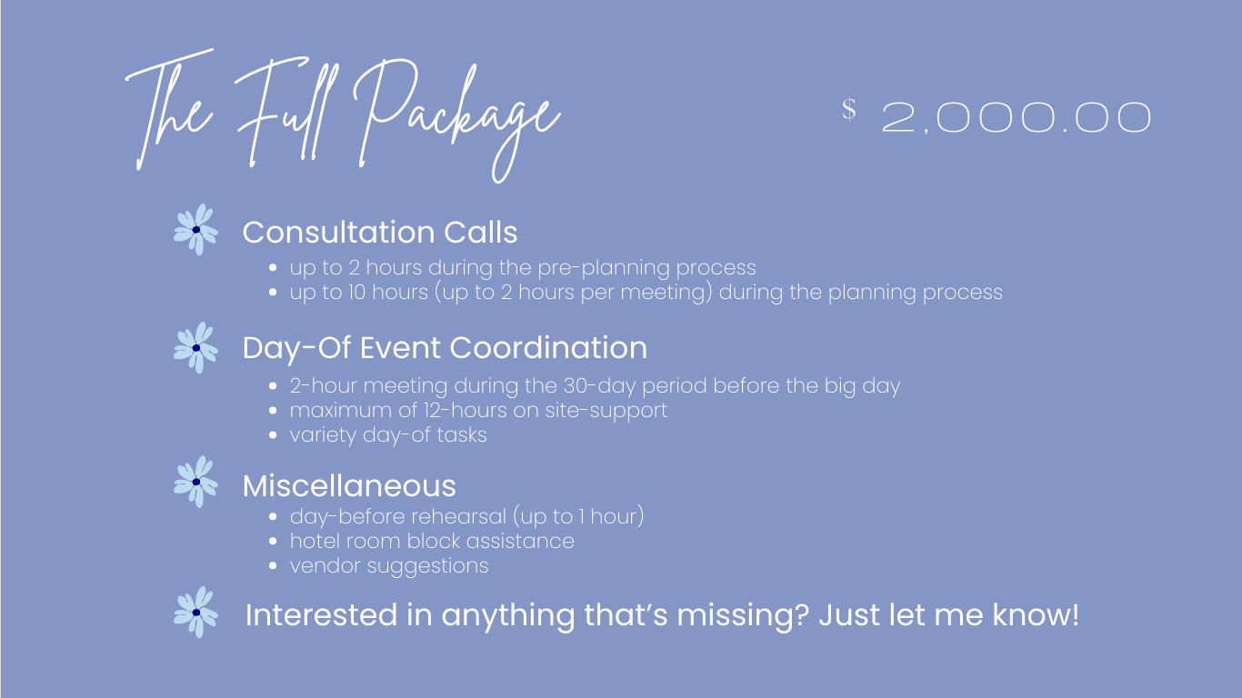 Flexibility is available on all packages and provided services, ensuring that you can tailor your experience to suit your unique needs. If something you’re interested in is missing from above, whether it be a specific service or a custom arrangement, or if you like an above service package but find it too expensive, please don’t hesitate to reach out and ask about adjustments! I am more than happy to collaborate with you to find the right balance between your vision and your budget. Your satisfaction is my priority, and I genuinely want to share my expertise to help others with their big days! Let’s work together to create an unforgettable experience that perfectly reflects your style and preferences.